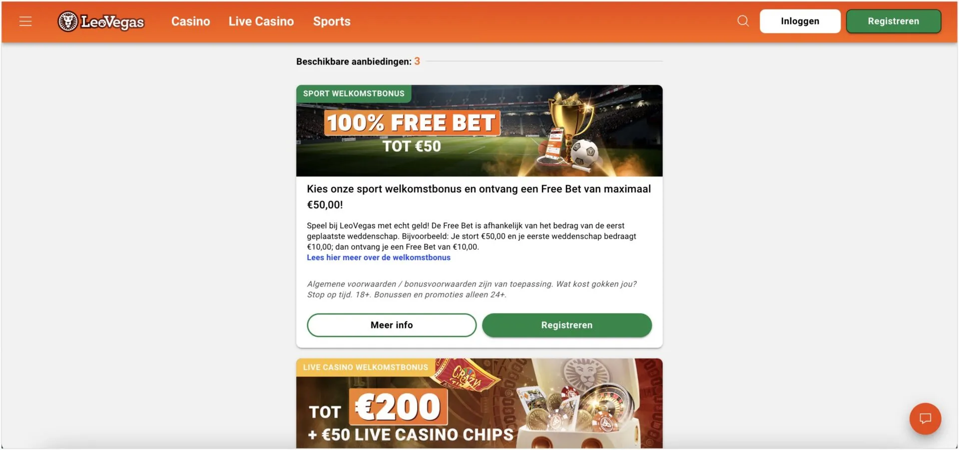 De één LeoVegas-welkomstbonus werkt als volgt: storting van minimaal €10, bonusbedrag is 100% tot €200, aangevuld met 1400 spins. De 15x-inzetvereiste geldt voor het bonusbedrag. De spins worden ingezet op het Henry the Ape-slot. De geldigheid is 7 dagen — wie de bonus niet binnen die termijn rondgespeeld heeft, verliest het resterende bonusgeld. Lees de actuele bonusvoorwaarden op het platform voor activering; deze kunnen per actieperiode wijzigen.