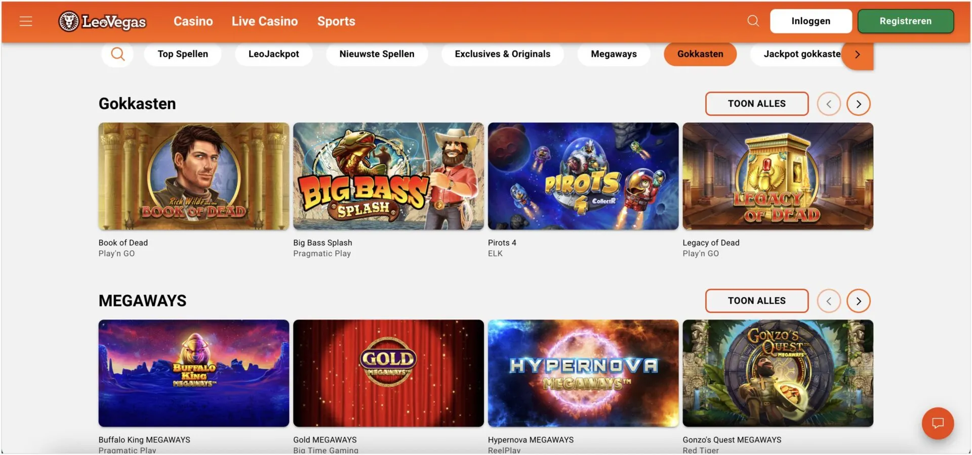 Het LeoVegas Live Casino biedt meer dan 200 live dealerspellen. Beschikbaar zijn live roulette inclusief Lightning Roulette en een exclusieve LeoVegas Roulette-tafel, exclusieve Infinite Blackjack, baccarat, live poker en live spelshows zoals Crazy Time en Dream Catcher. Nederlandstalige roulette met Nederlandssprekende dealers is beschikbaar. De livesectie draait op Evolution als primaire leverancier.
